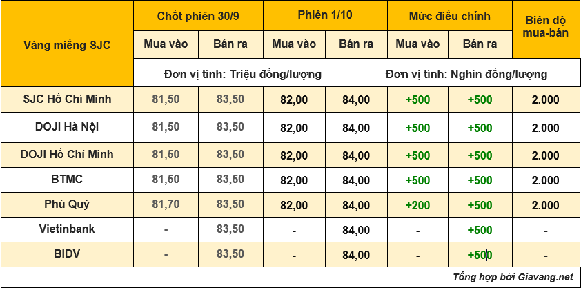 Cập nhật lúc 9h30 ngày 1/10, SJC Hồ Chí Minh điều chỉnh giá vàng miếng tăng 500.000 đồng/lượng cả hai chiều mua – bán so với đóng cửa phiên 30/9, đưa giao dịch lên 82,00 – 84,00 triệu đồng/lượng.