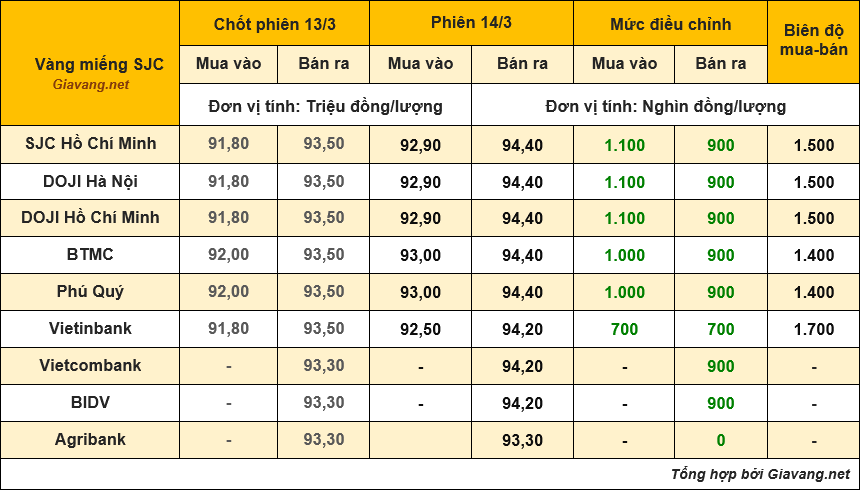 Bảo Tín Minh Châu và Phú Quý ghi nhận mức tăng 1 triệu đồng/lượng mua vào và 900.000 đồng/lượng bán ra so với cuối ngày hôm qua, đẩy giao dịch mua – bán lên cao kỷ lục 93 – 94,9 triệu đồng/lượng. Mức chênh giữa hai đầu giá giảm 100.000 đồng xuống ngưỡng 1,4 triệu đồng.