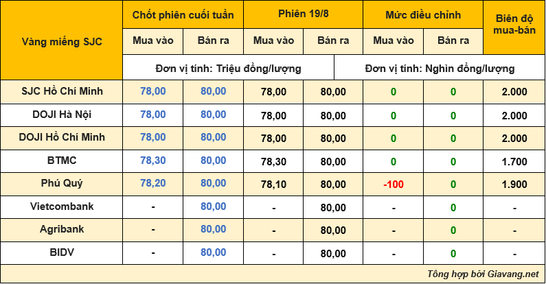 Cập nhật thời điểm 9h30 sáng đầu tuần 19/8, SJC Hồ Chí Minh niêm yết giao dịch mua – bán tại 78,00 – 80,00 triệu đồng/lượng, đi ngang cả hai chiều mua – bán so với cuối tuần trước.