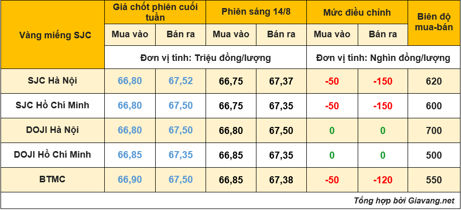 BTMC, niêm yết giao dịch mua – bán tại mốc 66,85 – 67,38 triệu đồng/lượng, giảm 50.000 đồng/lượng chiều mua, 120.000 đồng/lượng chiều bán so với chốt phiên trước đó.