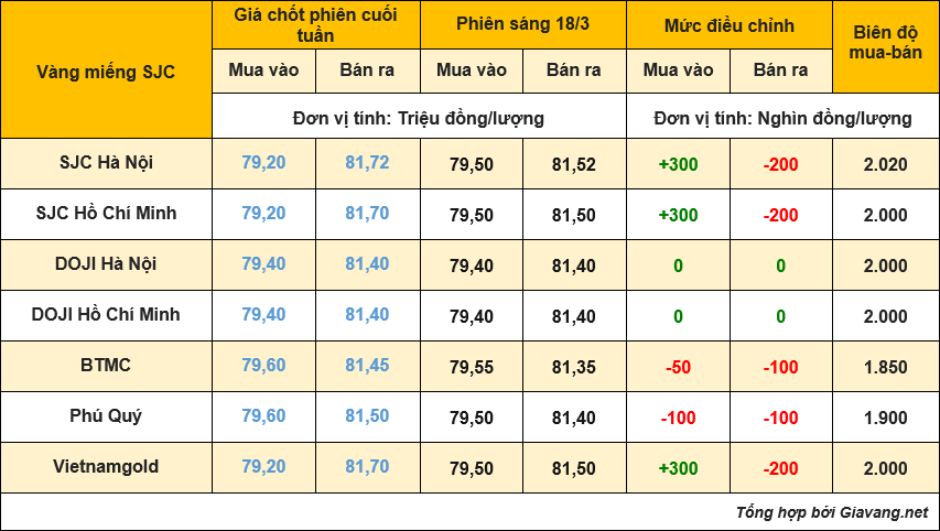 Mở cửa phiên đầu tuần 18/3, giá vàng miếng tại SJC Hà Nội có diễn biến tăng giá mua vào và giảm giá bán ra với mức điều chỉnh tăng 300.000 đồng/lượng giá mua và giảm 200.000 đồng/lượng giá bán so với chốt cuối tuần qua, giao dịch mua – bán hiện ở mức 79,50 – 81,52 triệu đồng/lượng.