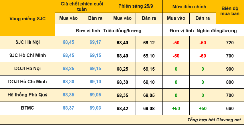 Tại SJC Hà Nội, vàng miếng mua vào – bán ra niêm yết ở mốc 68,40 – 69,12 triệu đồng/lượng, giảm 50.000 đồng/lượng cả hai chiều mua – bán so với giá chốt phiên trước.