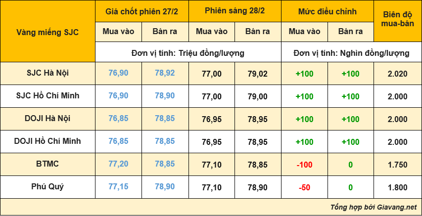 Cập nhật lúc 10h, SJC Hà Nội niêm yết giao dịch mua – bán tại mốc 77,00 – 79,02 triệu đồng/lượng, tăng 100.000 đồng/lượng mua vào và bán ra so với giá chốt phiên hôm qua 27/2.