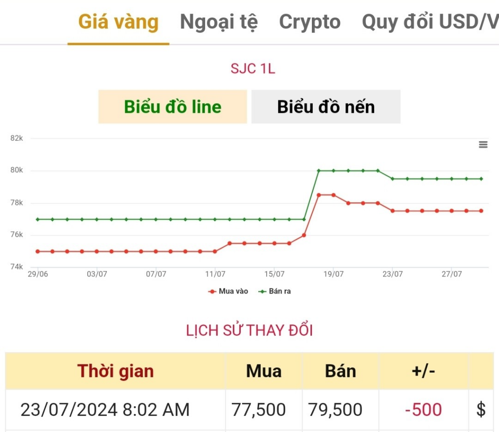 SJC Hồ Chí Minh: 77,50 – 79,50 triệu đồng/lượng.