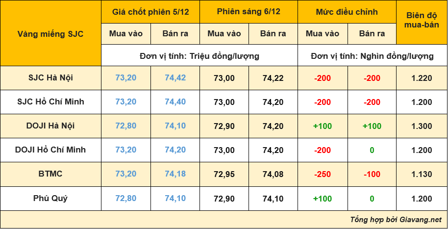 BTMC, niêm yết giao dịch mua – bán tại mốc 72,95 – 74,08 triệu đồng/lượng, mua vào giảm 250.000 đồng/lượng, bán ra giảm 100.000 đồng/lượng so với chốt phiên 5/12.