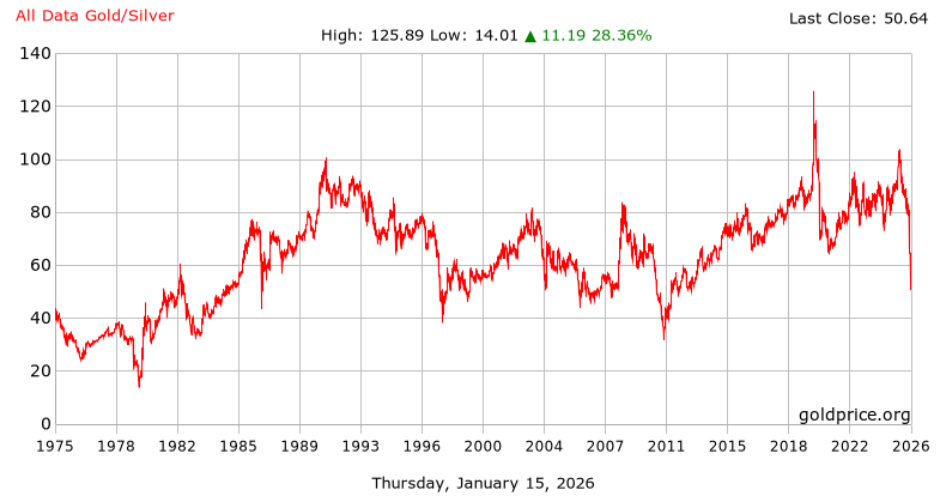 Đà phục hồi ấn tượng của bạc, với việc giá quay trở lại vùng trên 91 USD/ounce và tiệm cận mức đỉnh kỷ lục gần 93 USD/ounce, đã kéo tỷ lệ vàng/bạc giảm xuống quanh 50 điểm – mức thấp nhất kể từ tháng 3/2012. Trước đó, tỷ lệ này từng leo lên trên 100 điểm vào tháng 4/2025, cho thấy sự đảo chiều rất mạnh trong tương quan giữa hai kim loại quý.