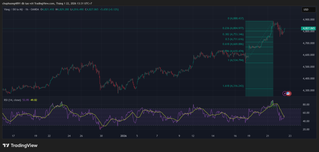 - SMA 100 giờ tiếp tục dốc lên và nằm dưới giá tại vùng 4.707,8 USD, đóng vai trò hỗ trợ động quan trọng.