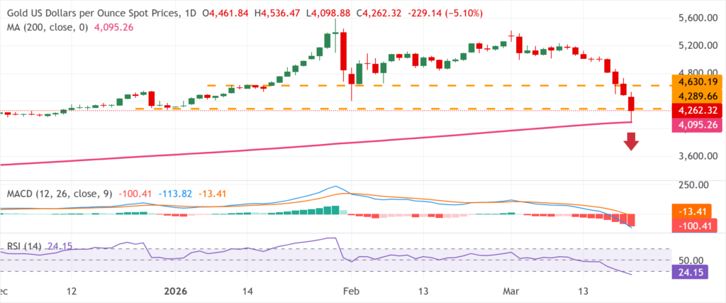 Giá vàng kéo dài chuỗi giảm sang ngày thứ tư liên tiếp, có thời điểm rơi xuống mức thấp nhất kể từ đầu năm. Tuy nhiên, trong phiên châu Âu, kim loại quý đã bật tăng trở lại từ đường trung bình động giản đơn (SMA) 200 ngày, cho thấy lực mua kỹ thuật bắt đầu xuất hiện.