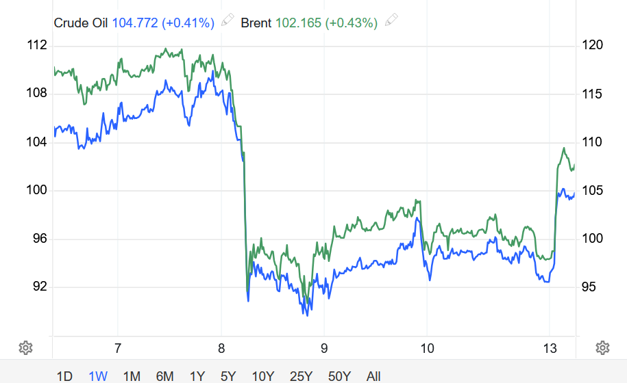 Thị trường năng lượng chứng kiến cú sốc lớn khi giá dầu West Texas Intermediate (WTI) mở cửa với khoảng trống tăng giá (gap up) lên tới 8,5%, hiện giao dịch sát mốc 98,00 USD/thùng.