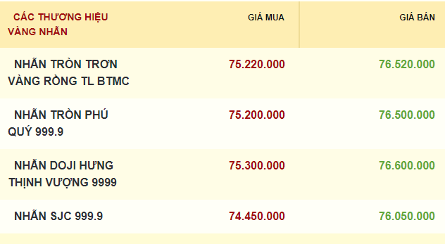 Nhẫn BTMC, niêm yết giao dịch mua – bán tại 75,22 – 76,52 triệu đồng/lượng, giá mua và bán đi ngang so với thời điểm mở cửa.