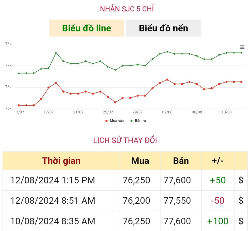 - Nhẫn Doji: 76,35 – 77,60 triệu đồng/lượng, cũng tăng 50.000 đồng so với sáng cùng ngày.