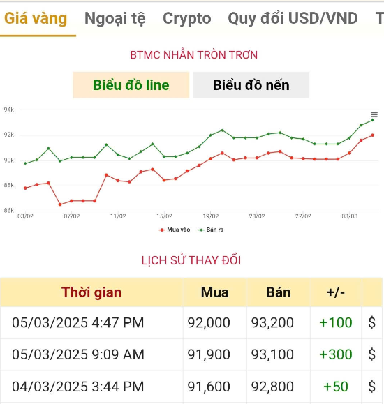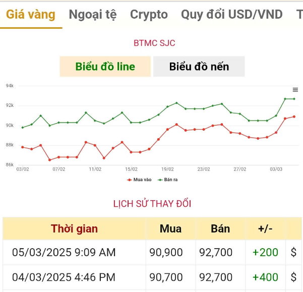 SJC Hồ Chí Minh: 90,7 – 92,7 triệu đồng/lượng, đi ngang cả hai chiều mua – bán so với chốt phiên 4/3.