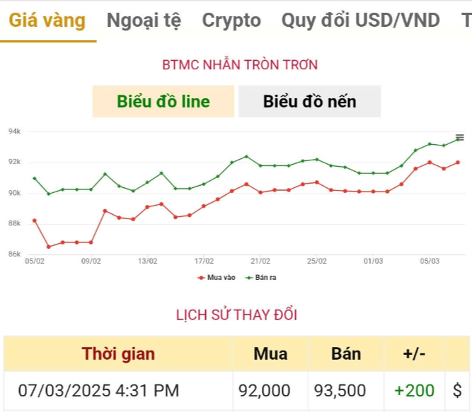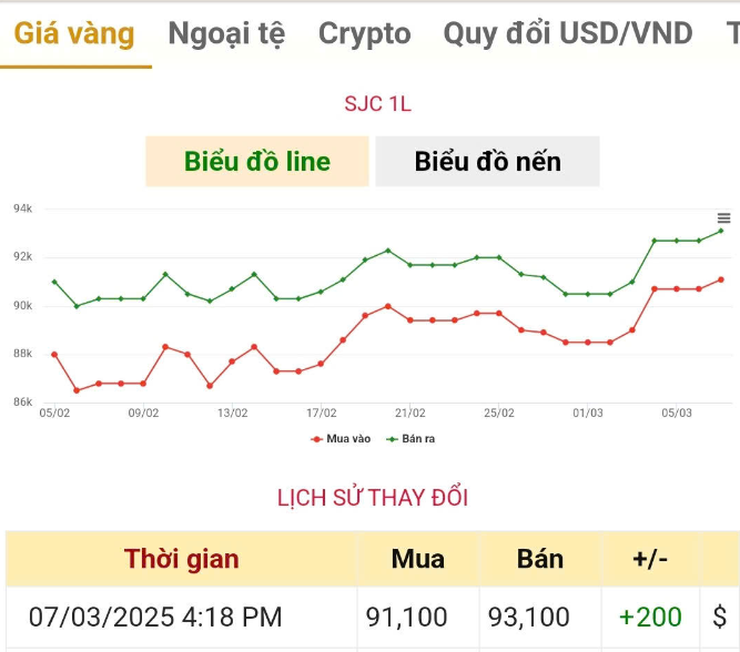 SJC Hồ Chí Minh: 91,1 – 93,1 triệu đồng/lượng, tăng 400.000 đồng/lượng cả hai chiều mua – bán so với chốt phiên 6/3.