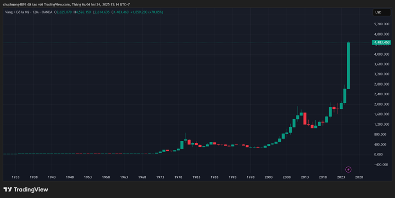 Thị trường vàng tịnh tiến dần dần, từ mức $2600 lên đỉnh cao gần mốc $4500/oz và tăng ổn định theo từng quý, cụ thể như sau: