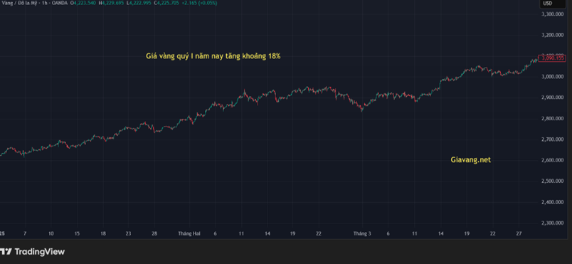 Vàng tăng 18% trong quý I, lần đầu tiên trong lịch sử đóng cửa trên $3000 vào ngày 18/3 năm nay.