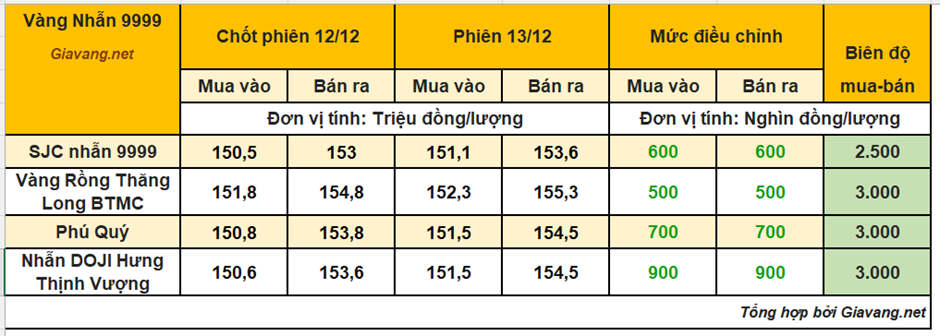 Bảo Tín Minh Châu định giá giao dịch tại 154,3 – 156,3 triệu đồng/lượng – giá mua tăng 700 nghìn đồng và giá bán cộng thêm 700 nghìn đồng mỗi lượng với chốt phiên ngày 12/12.