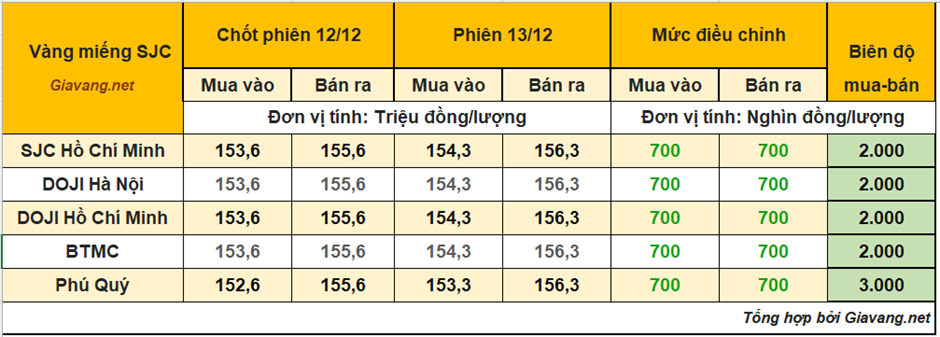 Bảo Tín Minh Châu định giá giao dịch tại 154,3 – 156,3 triệu đồng/lượng – giá mua tăng 700 nghìn đồng và giá bán cộng thêm 700 nghìn đồng mỗi lượng với chốt phiên ngày 12/12.