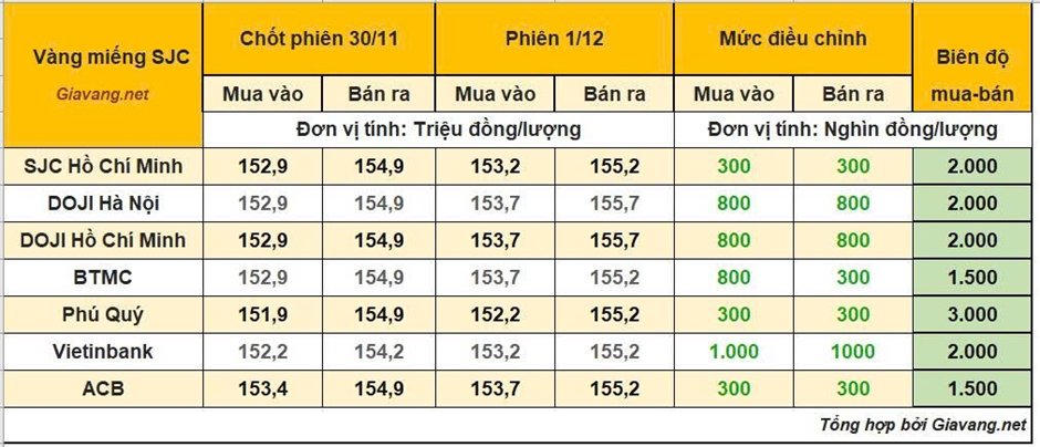 Cập nhật thời điểm 12h00 ngày 1/12, vàng miếng SJC Hồ Chí Minh niêm yết giao dịch mua – bán ở mức 153,2 – 155,2 triệu đồng/lượng, giá mua và giá bán cùng tăng 300 nghìn so với cuối ngày hôm qua.