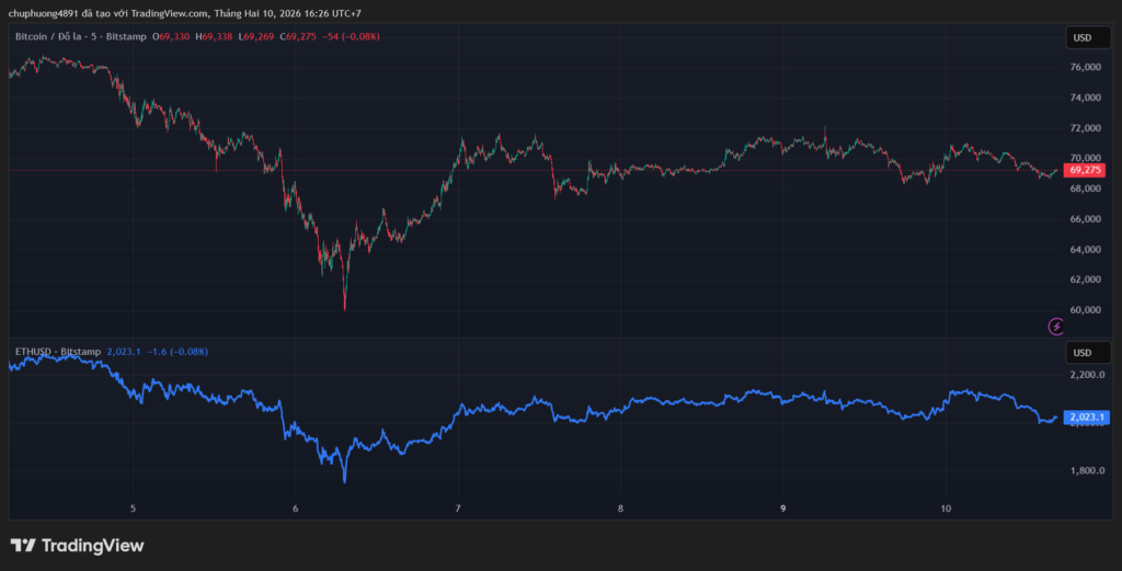 Thị trường tiền kĩ thuật số tiếp tục ổn định. BTC/USD neo quanh vùng 69.000. ETH/USD đi ngang quanh vùng 2000.