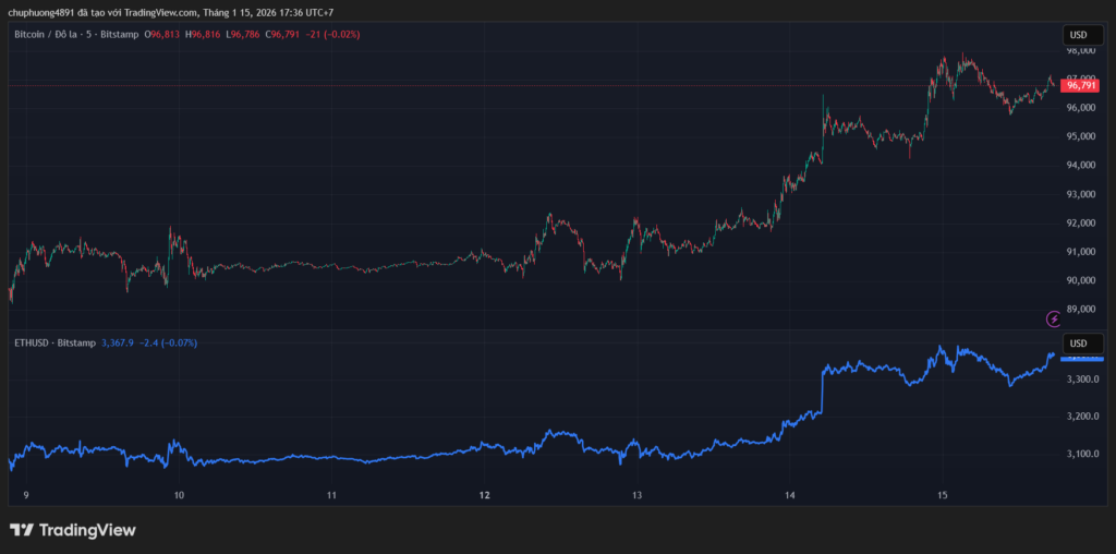 Thị trường tiền kĩ thuật số tiếp đà tăng. BTC/USD vượt mốc 97.000. ETH/USD vượt 3367.
