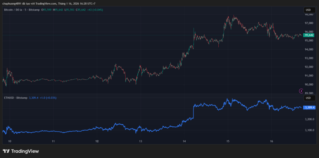 Thị trường tiền kĩ thuật số giằng co sau đà tăng. BTC/USD neo quanh mốc 96.000. ETH/USD quanh vùng 3300.