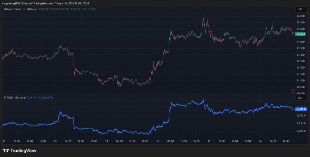 Thị trường tiền kĩ thuật số tăng nhẹ. BTC/USD vượt ngưỡng 74.600. ETH/USD neo mốc 2344.