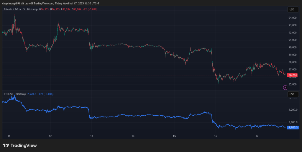Thị trường tiền kĩ thuật số giằng co tại vùng giá thấp. BTC/USD neo trênngưỡng 86.000. ETH/USD quanh vùng 2920.