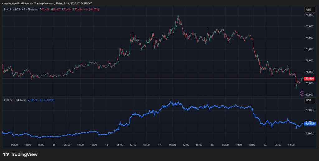 Thị trường tiền kĩ thuật số hồi phục sau đà giảm hôm qua. BTC/USD vượt mức 70.000. ETH/USD neo mốc 2100.