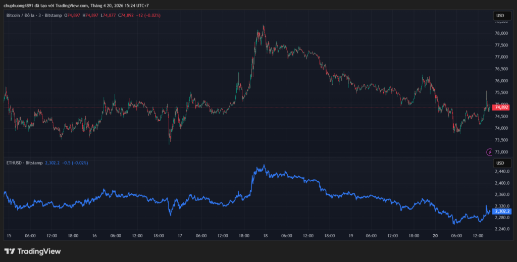 Thị trường tiền kĩ thuật số giảm sau khi tăng rất tốt vào ngày thứ Sáu. BTC/USD vượt ngưỡng 74.800. ETH/USD neo mốc 2302.