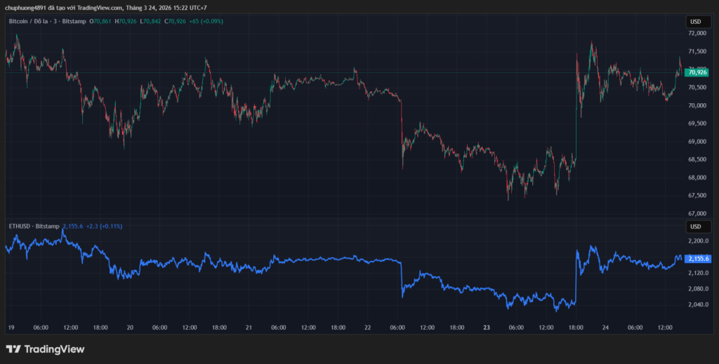 Thị trường tiền kĩ thuật số ổn định sau đà tăng cuối ngày hôm qua. BTC/USD vượt mức 71.000. ETH/USD neo mốc 2155.