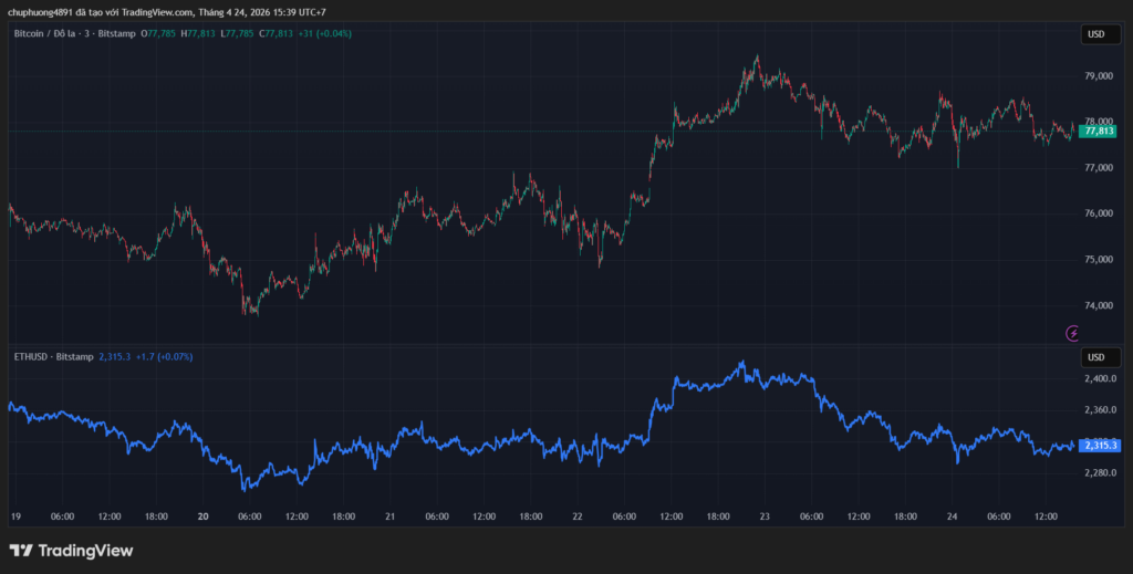 Thị trường tiền kĩ thuật số diễn biến giằng co. BTC/USD lùi về ngưỡng 77.800. ETH/USD neo mốc 23xx.