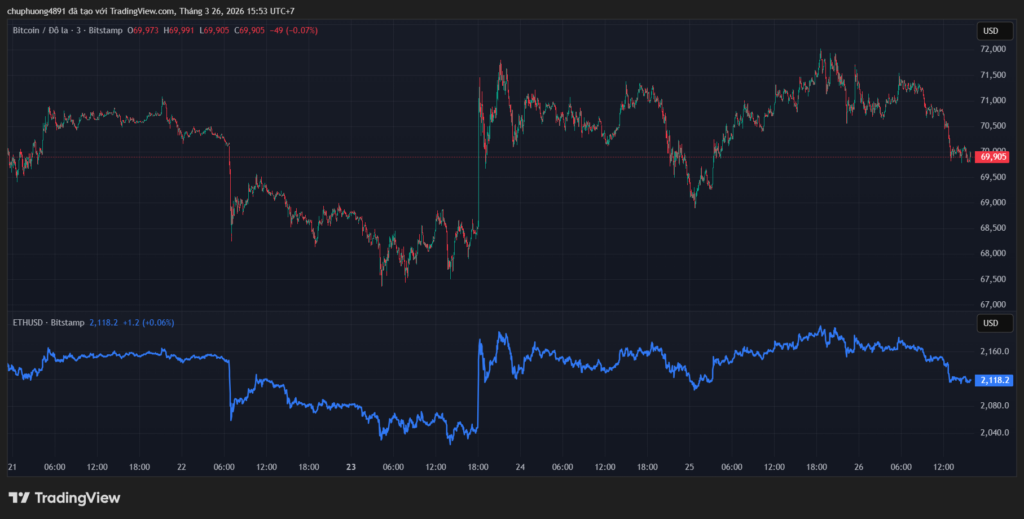 Thị trường tiền kĩ thuật số đi xuống. BTC/USD thủng mốc 70.000. ETH/USD neo mốc 2100.