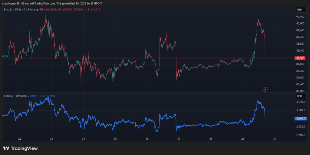 Thị trường tiền kĩ thuật số tăng nhanh rồi giảm rất nhanh trong phiên Á – Âu hôm nay. BTC/USD giảm về ngưỡng 88.000 sau khi chạm mốc 90.000. ETH/USD về 2950 sau khi vượt mốc 3040.