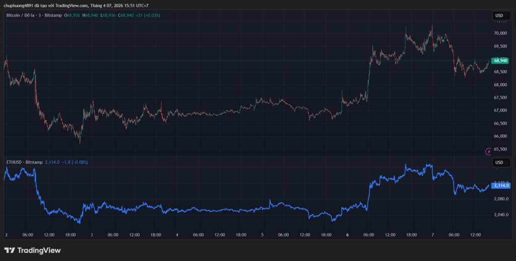 Thị trường tiền kĩ thuật số neo quanh vùng giá hôm qua. BTC/USD chạm vùng 68.000. ETH/USD neo mốc 2110.