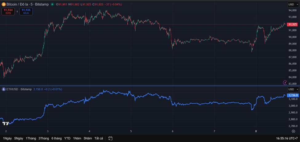 Thị trường tiền kĩ thuật số hồi phục tích cực. BTC/USD hiện nằm dưới mốc 92.000. ETH/USD quanh mức 3150.