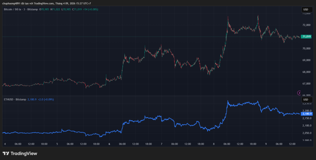 Thị trường tiền kĩ thuật số giảm nhẹ sau đà tăng hôm qua. BTC/USD vượt ngưỡng 71.000. ETH/USD neo mốc 2180.