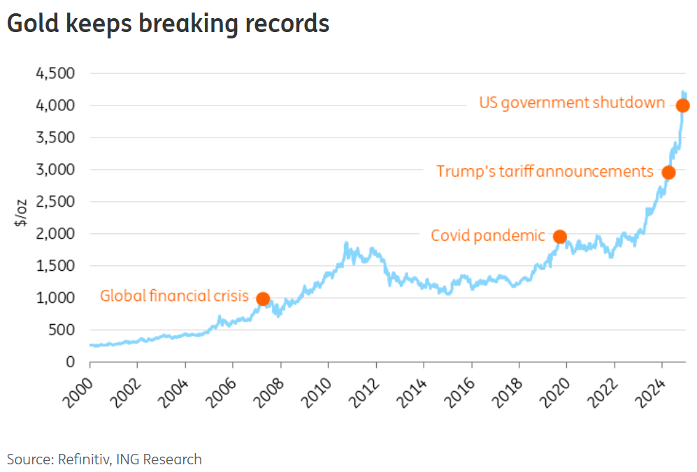 • Trong đợt đóng cửa Chính phủ Mỹ kéo dài gần đây, vàng chạm mốc 4.000 USD.