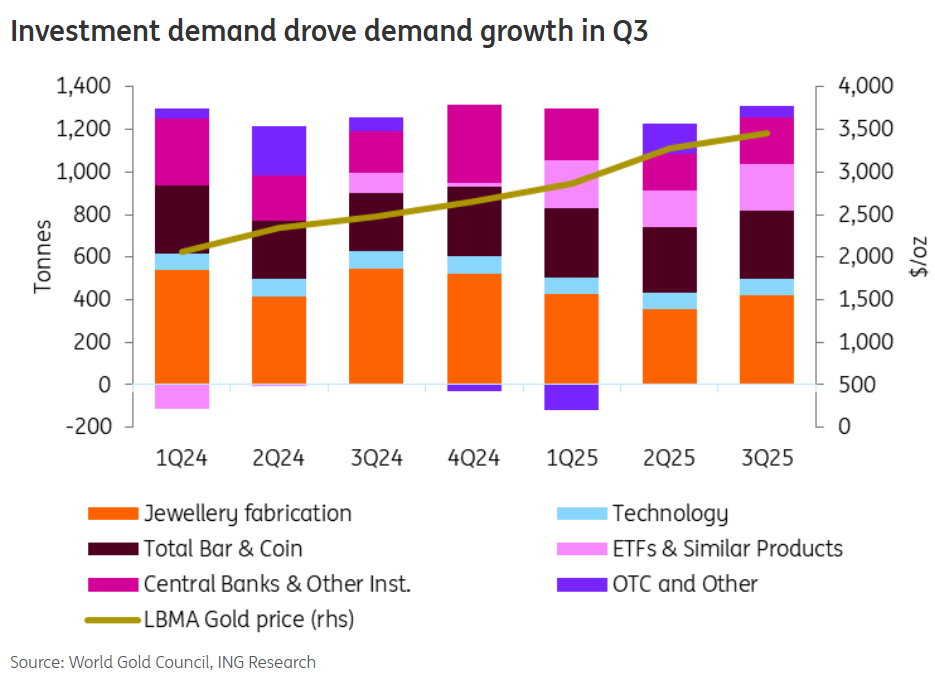 Theo Hội đồng Vàng Thế giới (WGC), nhu cầu vàng toàn cầu quý III đạt 1.313 tấn – mức cao nhất mọi thời đại. Động lực tăng trưởng đến từ: