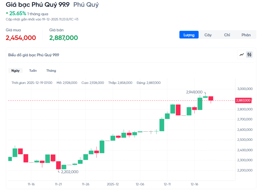 (GVNET) Giá bạc thế giới (XAG/USD) quay đầu giảm trong phiên giao dịch châu Á sáng thứ Sáu (19/12), khi áp lực chốt lời xuất hiện sau chuỗi tăng mạnh trước đó. Tuy nhiên, xu hướng giảm của kim loại quý này được đánh giá là không quá sâu, trong bối cảnh kỳ vọng Cục Dự trữ Liên bang Mỹ (Fed) sớm cắt giảm lãi suất ngày càng gia tăng.