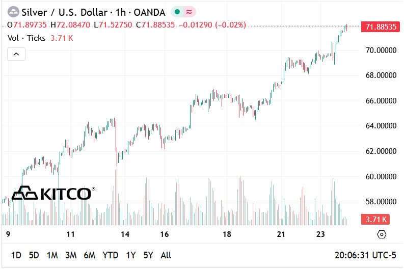 Giá bạc thế giới tiếp tục bứt phá mạnh mẽ, thiết lập mức cao kỷ lục mới trên 71 USD/ounce trong bối cảnh căng thẳng địa chính trị leo thang và thị trường đặt cược vào khả năng Cục Dự trữ Liên bang Mỹ (Fed) tiếp tục nới lỏng chính sách tiền tệ.