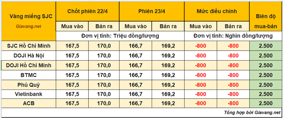 DOJI Hà Nội và Hồ Chí Minh, niêm yết giao dịch mua – bán ở mức 166,7 – 169,2 triệu đồng/lượng, giá mua giảm 800 nghìn và giá bán hạ 800 nghìn so với cuối ngày 22/4.