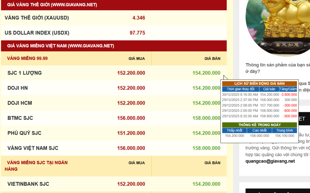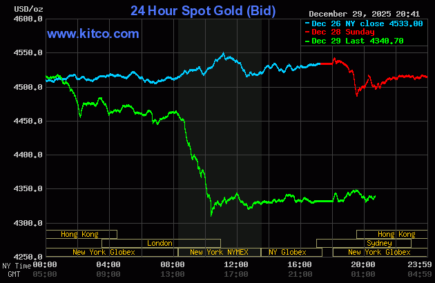 Không nằm ngoài xu hướng chung, giá vàng giao ngay giảm 4,2%, xuống 4.343,38 USD/ounce tính đến 15h05 (giờ New York) ngày 29/12. Trong phiên, vàng có lúc giảm tới 5%, đánh dấu mức giảm trong ngày mạnh nhất kể từ 21/10 và là lần thứ hai trong năm 2025 kim loại quý này sụt giảm hơn 5% chỉ trong một phiên.
