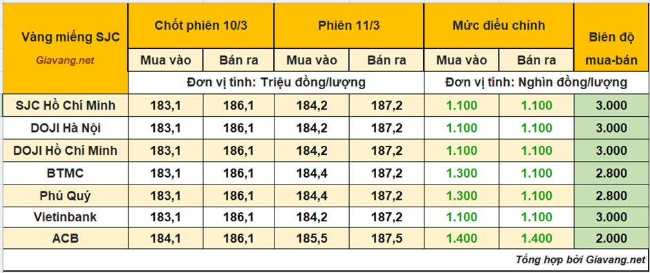 DOJI Hà Nội và Hồ Chí Minh, niêm yết giao dịch mua – bán ở mức 184,2 – 187,2 triệu đồng/lượng, giá mua tăng 1,1 triệu và giá bán tăng 1,1 triệu so với giá chốt phiên 10/3.