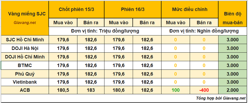 - ACB: giao dịch mua vào bán ra ở mức 180,6 – 182,6 triệu đồng mỗi lượng – chiều mua tăng 100 nghìn và chiều bán hạ 400 nghìn so với cuối ngày 14/3.