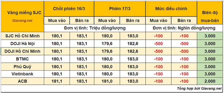 DOJI Hà Nội và Hồ Chí Minh, niêm yết giao dịch mua – bán ở mức 179,6 – 182,6 triệu đồng/lượng, giá mua giảm 500 nghìn và giá bán hạ 500 nghìn so với giá chốt phiên 16/3.