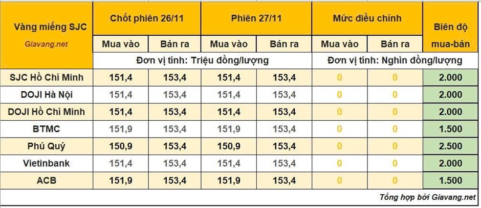 DOJI Hà Nội và Hồ Chí Minh, niêm yết giao dịch mua – bán ở mức 151,4 – 153,4 triệu đồng/lượng, giá mua và giá bán cùng đi ngang so với giá chốt phiên 26/11.