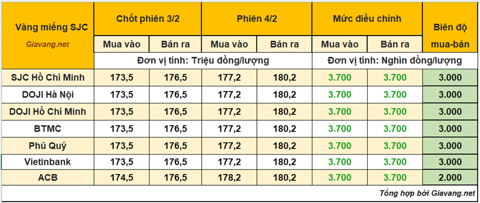 - ACB: giao dịch mua vào bán ra ở mức 178,2 – 180,2 triệu đồng mỗi lượng – chiều mua tăng 3,7 triệu và chiều bán tăng 3,7 triệu so với cuối ngày 3/2.