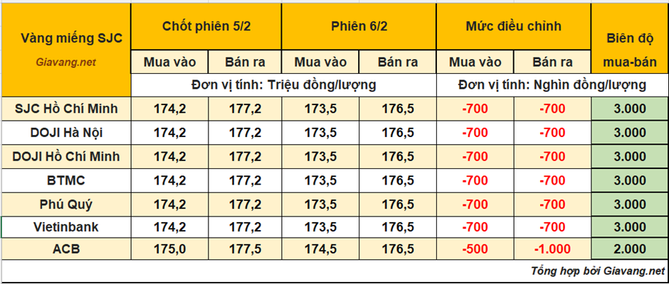 • ACB: giao dịch mua vào bán ra ở mức 174,5 – 176,5 triệu đồng mỗi lượng – chiều mua giảm 500 nghìn và chiều bán hạ 1 triệu so với cuối ngày 5/2.
