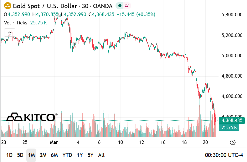 Kim loại quý này đã giảm đáng kể từ mức khoảng 5.200 USD/ounce vào ngày 3/3 xuống còn 4.354 USD/ounce vào ngày 23/3, phản ánh một đợt điều chỉnh mạnh trong thời gian ngắn.