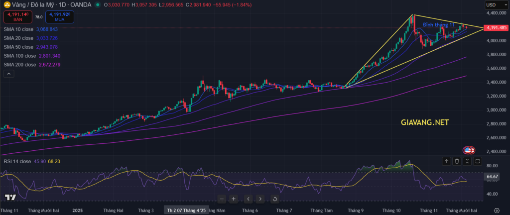 Đây là điểm mà nhịp tăng thứ hai từ đáy tháng 10 ($3.886) bằng đúng biên độ của nhịp tăng trước đó – vùng kháng cự đối xứng. - Mục tiêu cao hơn: $4.381 – đỉnh lịch sử